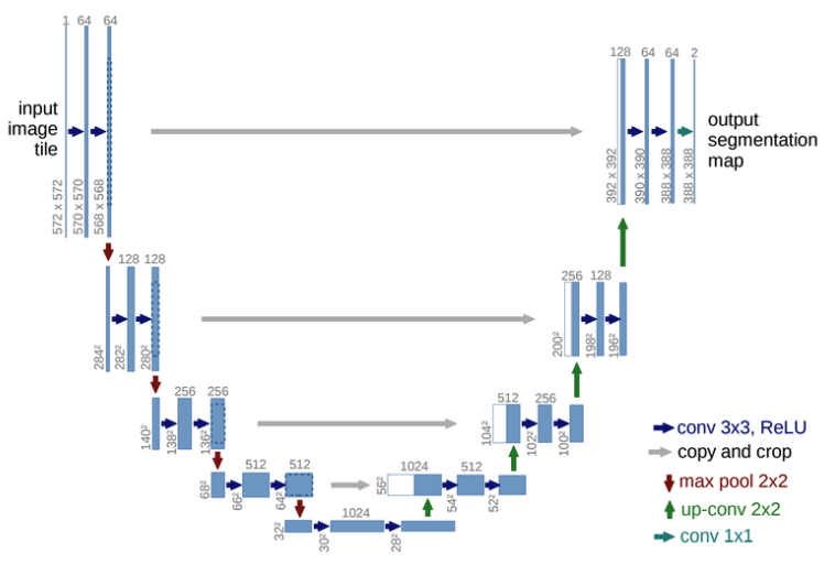572X572 크기인 이미지가 input 으로 들어가고 , 388X388 크기의 두 가지 클래스를 가진 segmentation map이 output으로 나온다.