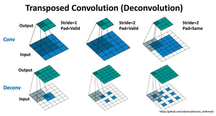 - Convolution Layer는 kernel의 크기를 정의하고 입력된 feature를 window에 따라서 output을 계산하는데, Transposed Convolution은 이와 반대의 연산을 하여 더 넓은 영역의 값을 추정한다.