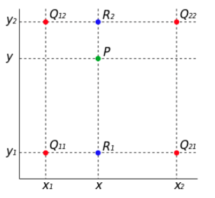 - $R_1$ 이 $Q_{11}$과 $Q_{21}$의 x축 방향의 interpolation 결과, $R_2$는 $Q_{12}$와 $Q_{22}$의 x축방향 interpolation 결과.