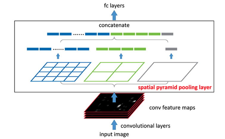 Spatial Pyramid Pooling은 여러가지 스케일로 convolution과 pooling을 하고 나온 다양한 특성을 concatenate해준다.
