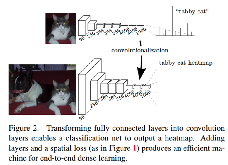 - CNN은 이미지 내 위치의 특성을 유지하고 fully connected layer는 위치를 고려하지 않게 된다. 위치정보를 유지하면서 클래스 단위의 heat map을 얻어 세그멘테이션을 하기 위해 CNN을 붙인다.