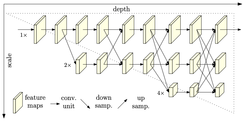 아이디어 : HRNet에서는 down sample layer를 만들고 작아진 layer feature 정보를 다시 upsampling해서 원본 해상도 크기에 적용하는 모델을 제안